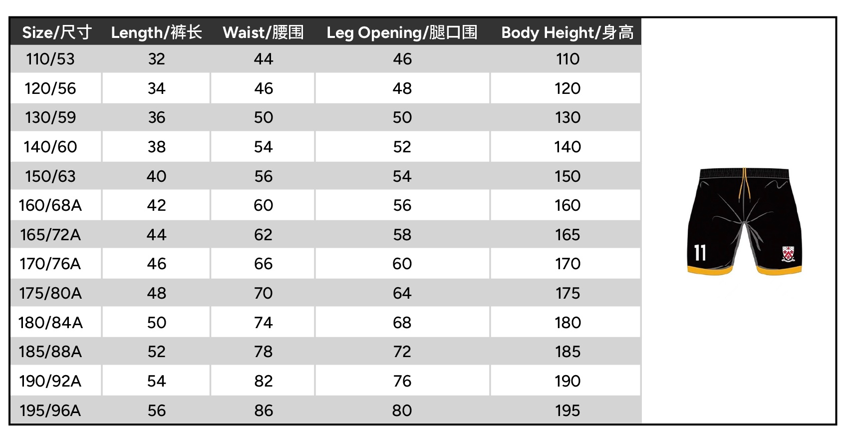 Size 110 or 120 or 130 or 140 or 150 or 160 or 165 or 170 or 175 or 180 or 185 or 190 or 195